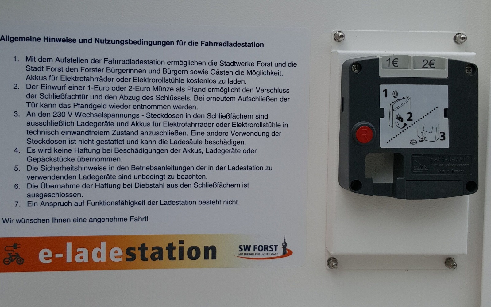 Die E-Bike-Ladestation steht am Hotel Haufe in der Cottbuser Straße in Forst (Lausitz). E-Biker können hier kostenfrei Ihren E-Bike-Akku aufladen. An der Ladestation befinden sich 3 Schließfächer mit je 2 Steckdosen für die Akkus. Für die Schließfächer benötigt man nur eine 1,00 Euro oder 2,00 Euro Münze als Pfand zum Verschließen der Tür. Diese Münze erhält man nach dem Öffnen der Tür wieder.