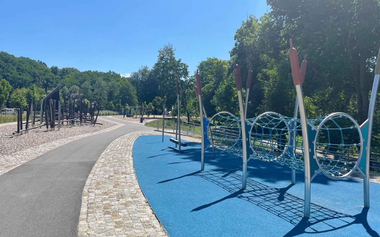 Der Themenspielplatz ist in verschiedene Bereiche gegliedert und bietet für jede Alterskategorie etwas. Es gibt themenreiche Kindersinnwelten mit Wassermann und regionalen Sagen. Er ist in drei klar differenzierte Zonen unterteilt: U3‑Bereich, Kletter‑/Balanceteil („Gespinnst“) und abenteuerliche Hintergrundzone mit Kapellen‑Nachbildung.