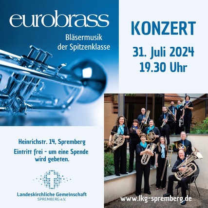 Erleben Sie Blechbläsermusik auf höchstem Niveau mit dem Ensemble eurobrass. Das Ensemble wird dieses Jahr wieder auf Deutschland-Tournee sein, um ein begeisterndes Programm mit viel Liebe zum Detail und mitreißender Spielfreude vorzutragen. Musik aus ver-schiedenen Stilen und Epochen spiegelt die Vielfalt des Lebens und den Reichtum von Gottes Schöpfung wider. Freuen Sie sich auf bekannte und verborgene Schätze aus Klassik, Choral, Pop, Jazz und Gospel! Die 12 Mitglieder, des in wechselnder Besetzung seit 46 Jahren bestehenden Profi-Ensembles, kommen aus den USA und Deutschland. Im Konzert erklingen verschiedene Arten von Trompeten und Posaunen wie auch Waldhorn, Euphonium und Tuba. Kurze Über-leitungen zwischen den Musikstücken und Wortbeiträge, die vom christlichen Glauben der Musiker erzählen, runden das Programm ab. Das Ensemble eurobrass ist das Flaggschiff des Vereins "eurobrass – Musik, die weiterträgt” mit Sitz in Königsfeld im Schwarzwald.