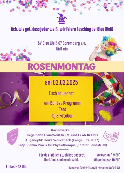 Der SV Blau Weiß 07 Spremberg e.V. lädt alle Närrinnen und Narren zu einer ausgelassenen Faschingsfeier ein. Unter dem Motto "Ach, wie gut, dass jeder weiß – wir feiern Fasching bei Blau Weiß!" erwartet die Gäste ein farbenfrohes Programm mit mitreißender Musik, Tanz und bester Unterhaltung.