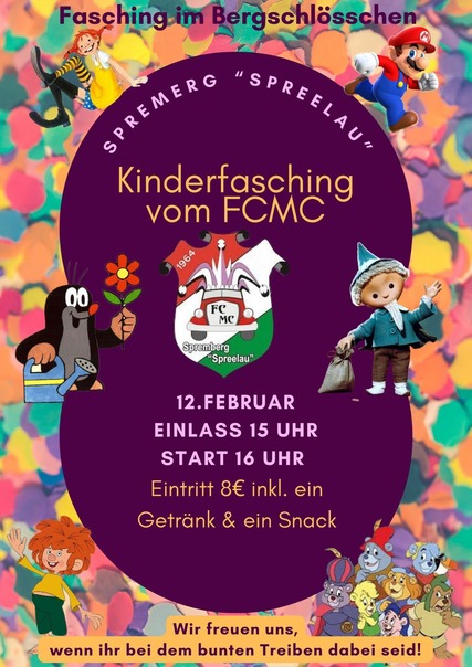 Der FCMC lädt alle Kinder und Familien herzlich zum bunten Faschingstreiben ins Bergschlösschen ein! Mit fröhlicher Musik, spannenden Spielen und jeder Menge Spaß erwartet euch ein unvergesslicher Nachmittag. Ob verkleidet als Prinzessin, Superheld oder Märchenfigur – der Fantasie sind keine Grenzen gesetzt!