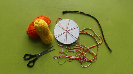 Dazu wird von jedem Teilnehmer eine Kumihimo-Scheibe selbst hergestellt. Gerne können Reste von