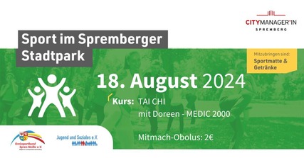 Am kommenden Sonntag, den 18. August 2024, laden wir dich herzlich zu einer entspannenden Tai Chi-Stunde im wunderschönen Spremberger Stadtpark ein. Von 10:00 bis 11:00 Uhr wird Doreen vom Medic 2000 uns in die sanfte Kunst des Tai Chi einführen.
