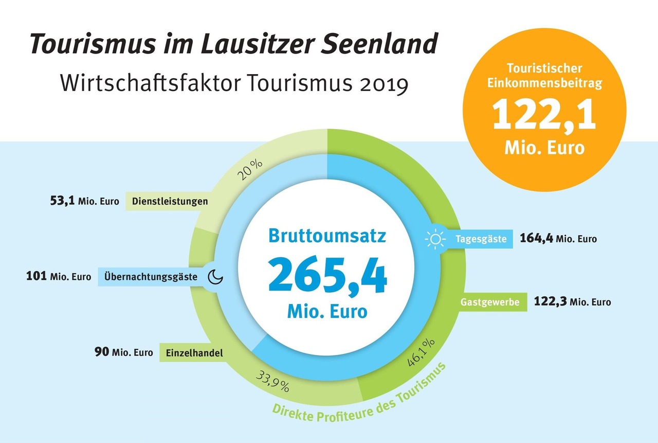 Insgesamt konnte im Corona-unbeeinflussten Jahr 2019 im Lausitzer Seenland ein Bruttoumsatz von 265,4 Mio. € erwirtschaftet werden, der sich aus dem Nachfragevolumen und der oben genannten Tagesausgaben errechnet. Dabei entfielen insgesamt 101,0 Mio. € auf den Übernachtungstourismus und 164,4 Mio. € auf den Tagestourismus. Das Gastgewerbe ist hierbei mit einem Umsatz von 122,3 Mio. € die Branche, die am stärksten vom Tourismus profitiert, gefolgt vom Einzelhandel mit 90,0 Mio. € und den Dienstleistungen mit 53,1 Mio. €.