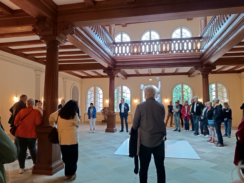Im Rahmen des Netzwerkabends konnten die Teilnehmenden bei Führungen die Jubiläumsausstellung 30. Rohkunstbau zum Thema „Ästhetische Wiederbewaffnung“ im Altdöberner Schloss besichtigen, die noch bis zum 2. November zeitgenössische Kunst hochkarätiger internationaler Künstler präsentiert. Auch die im Jahr 1921 erbaute evangelische Kirche auf dem Marktplatz und die alte Brennerei Riedel & Sohn, die bis 2030 im Rahmen des Projekts Lokatorium zu einem Wirtschafts-, Kultur- und Innovationszentrum entwickelt wird, standen auf dem Programm.