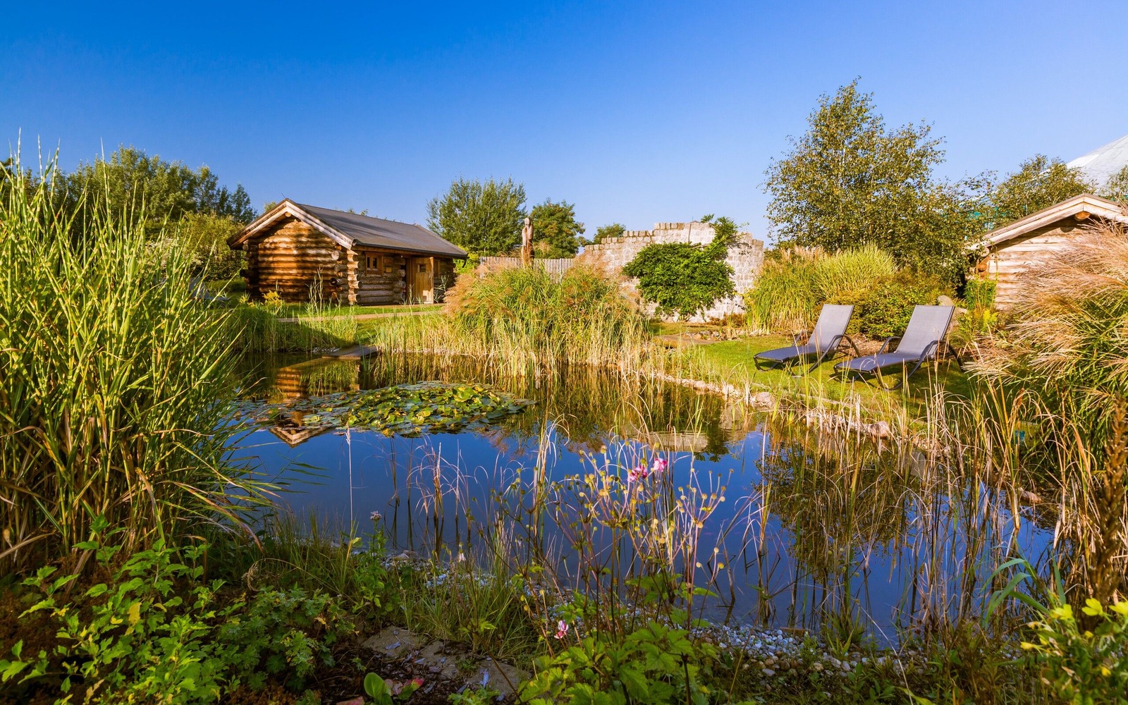 The dreamy sauna village with rustic log cabins and integrated Finnish saunas is very popular in every season. Nature lovers can relax and recharge in the harmonious atmosphere of the garden pond with a stream.