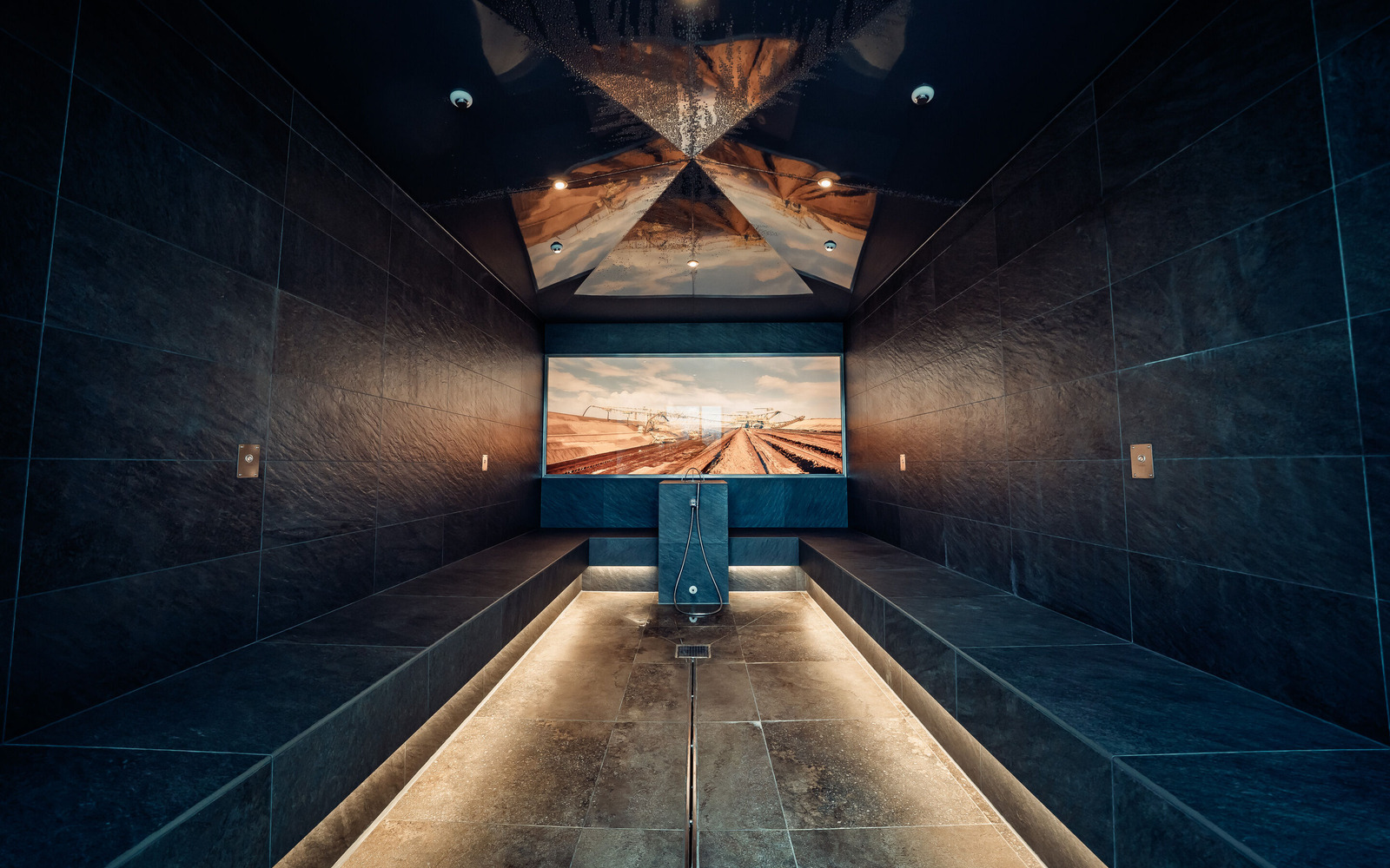 For refreshment after each sauna session, the wellness shower area with various shower options and ice fountains, a cold plunge pool at approximately 12°C, and an outdoor brine pool offer a pleasant change of pace.
